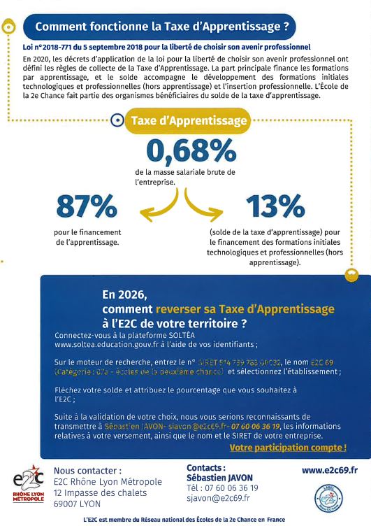 Depuis février 2009, les Écoles de la 2e Chance sont habilitées à collecter la Taxe d’Apprentissage. La collecte permet chaque année à l’E2C Rhône Lyon Métropole de renforcer les conditions d’accueil de ses stagiaires.